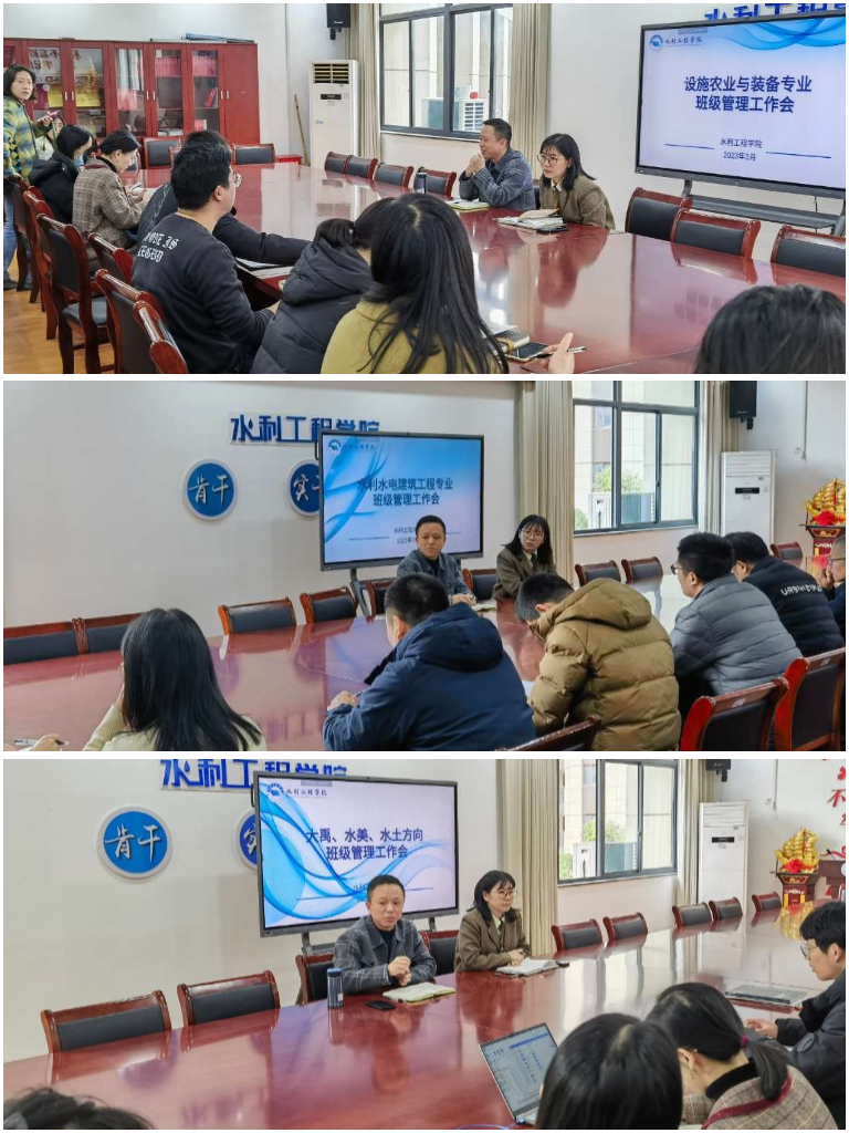 为扎实推进水利工程学院班级管理工作,提高班主任和专业辅导员在学生日常思政教育和事务管理的效率,明确工作职责,3月1日下午,水利工程学院召开各专业班级管理工作通气会。学院党总支书记叶乐、党总支副书记石杨,全体辅导员、全体班主任参加会议。