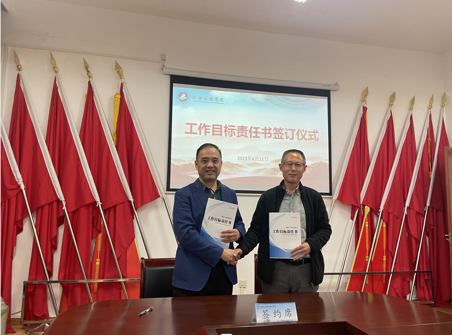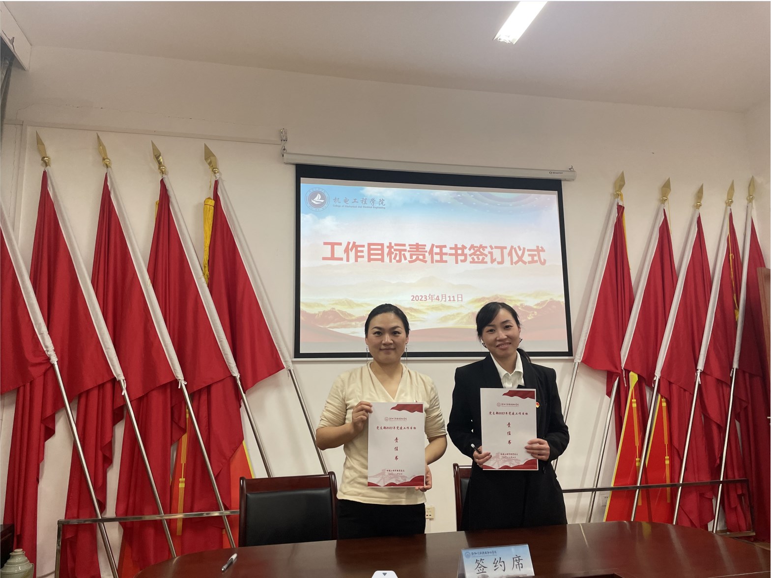 4月11日,机电工程学院2023年目标责任书签订仪式在钱江楼C513会议室举行。学院党总支书记、院长金永琪、党总支副书记章卉参加会议。