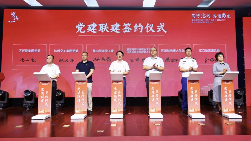 为深入学习贯彻习近平新时代中国特色社会主义思想,不断深化“党建联建,共促发展”工作,凝聚合力深化校地合作,着力构建校企社党建工作新格局,创新推动党建工作高质量发展,6月30日上午,经济与信息学院党总支与萧山区蜀山街道党工委、萧山区消防救援大队党委、杭州交工集团党委、萧山区交投集团党委、萧山区环投集团党委开展党建联建签约仪式。经信学院党总支书记王志远出席会议并代表签约。