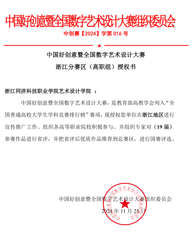 近日,艺术设计学院获得2025年第19届中国好创意暨全国数字艺术设计大赛浙江分赛区(高职组)的承办院校授权,这标志着我校在数字艺术设计、乡村振兴创意设计教育领域取得的成绩得到了广泛认可。