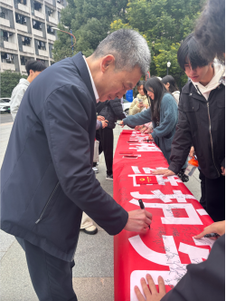 活动尾声,学校校长王卫标带领师生踊跃参与“弘扬宪法精神,维护宪法权威”主题签名活动。大家郑重签下姓名,许下尊崇宪法、践行法治的庄重承诺,彰显携手共筑法治校园决心。