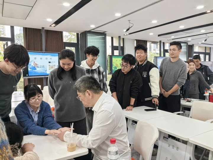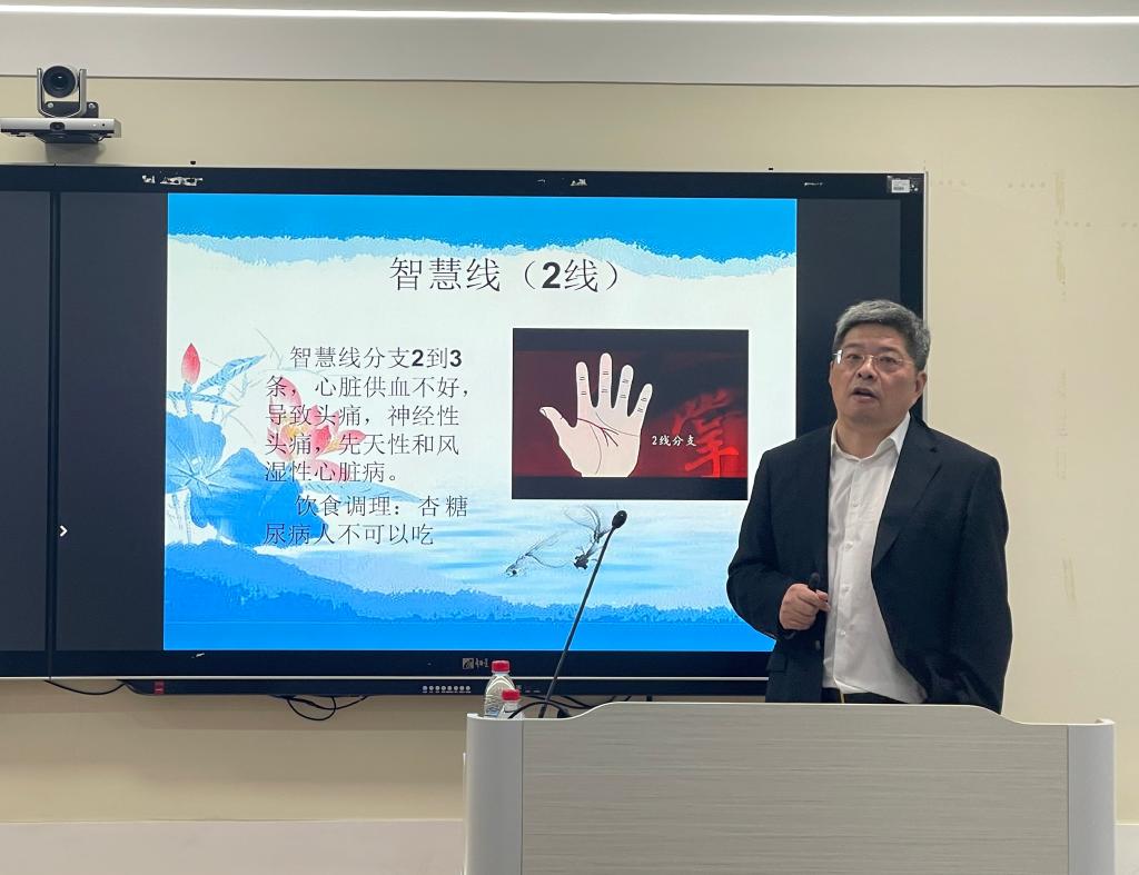 随后,陈医师聚焦于“手诊”这一传统中医诊断方法,详细讲解了手掌上的14条主线,包括感情线、生命线、智慧线、健康线等。他结合生动实例,为大家解析如何通过观察手掌的形态、色泽与纹路变化,初步判断身体健康状况,识别潜在健康隐患,并提供了相应的调理建议。讲座最后,陈医师还现场为师生进行了手诊互动,气氛活跃。
