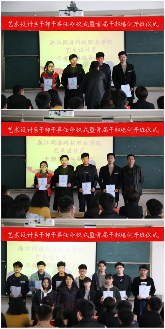 新一届学生会主席丁金鑫和宣传部长施军良分别代表新一届主席团和学生干部上台发言;艺设系全体领导班子成员为新一任团学干部颁发了聘书,并和学生干部代表合影留念。