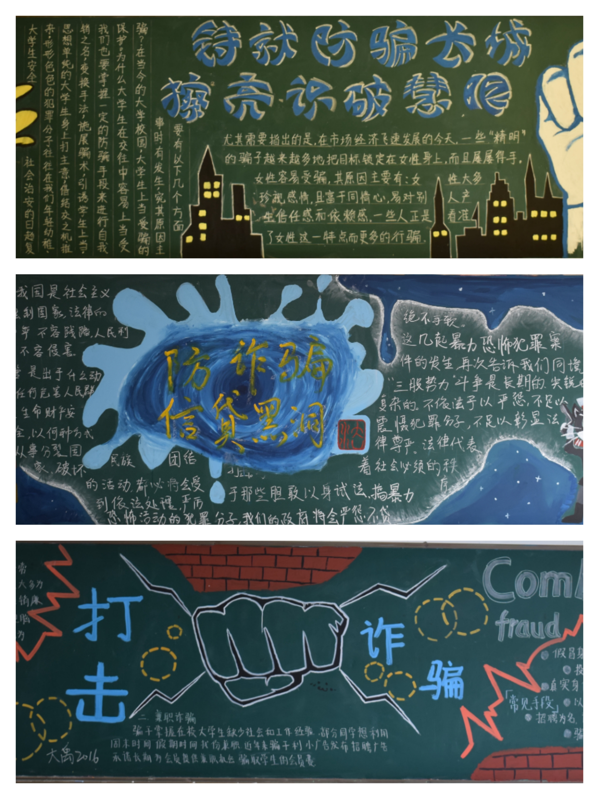防诈骗主题教育活动周内容丰富,包括:各班开展“防诈骗 我安全”主题班会、以 “绷紧防范之弦,谨防新型诈骗”为主题的黑板报评选、防网络诈骗的专题教育讲座、组织“骗你‘用心’,绝不理睬”签名活动、组织绘制以“铸就防骗长城,擦亮识骗慧眼”为主题的海报;以防诈骗为主题的演讲大赛等;形式多样,有防骗知识宣讲、有专题教育讲座、有主题评选和演讲比赛等。