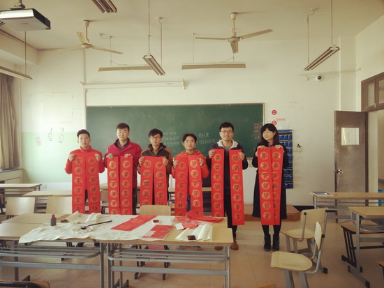 本次活动,由汽配15-02班团支书余杭磊同学发起,组织书法爱好者现场书写春联,同学们纷纷到场观摩。教室墨汁飘香,洋溢着浓浓的节日氛围。随后,大家把书法春联作品赠送给2015级各班级团支部和机电系的一些老师。大家拿到喜气洋洋,象征着幸福快乐的大红春联,表示了自己由衷的感激和赞美。同学们表示,今后将继续开展书法研习和讨论,把中华文化发扬光大,努力为机电系老师、同学营造更加浓厚的学习氛围,增添文化情趣。