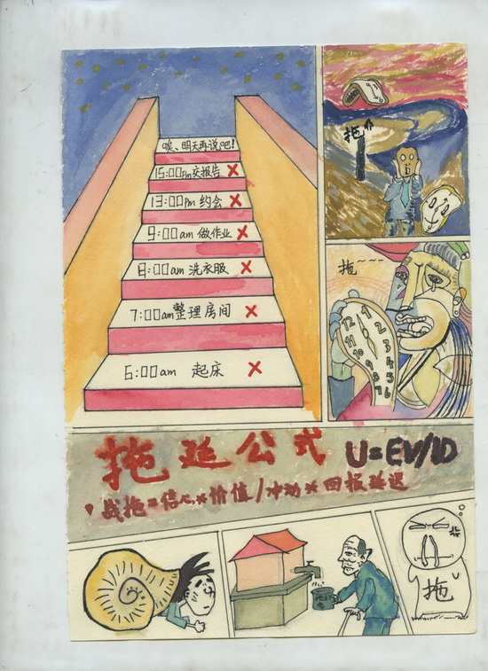 本次大赛共征集全院学生个人或者集体作品31幅,经心理辅导员和艺术系多位专任教师匿名评选,共选出装饰1503冯晓玲、环艺1502章静桢、工管1501赖荷裕等9位同学的拖延症心理漫画作品获得一二三等奖。