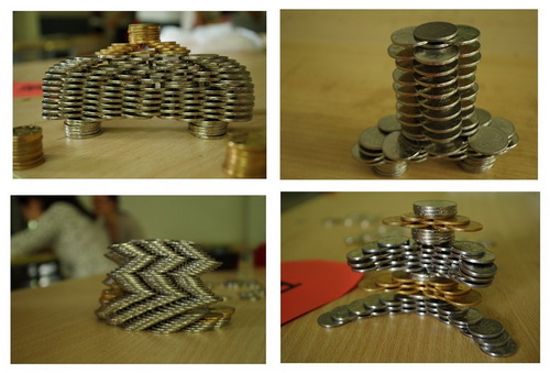 活动过程中,选手们参赛热情高涨,纷纷发挥想象力和创造力,在规定时间内,舞动小小硬币,搭建出花样繁多的建筑造型。各种精美造型展现在面前——“伦敦桥”造型下面悬空,利用桥梁上边对下边压力所产生的力矩,使整个桥得以平衡;“梯田”造型斜着摆放、一部分悬在空中不倒,则是利用了平衡原理,只要重心不超过支撑点它就不会倒。