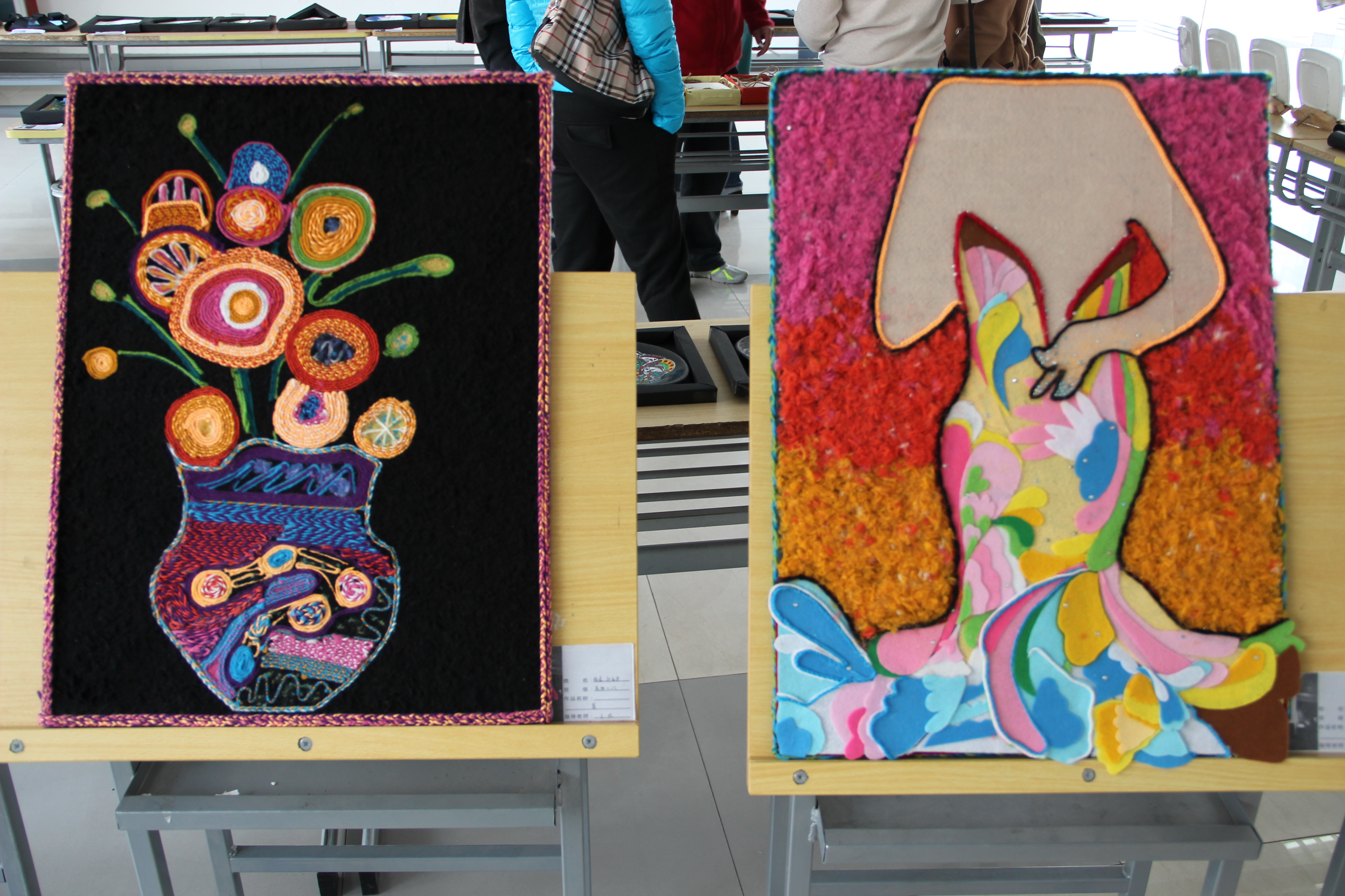 展览上,同学们分别展出了手绘瓷盘、纤维拼贴装饰画,及利用铁丝及废旧碟片等材料制作的简易装置等等。大家各显其能,充分发挥想象力,使用的材料技法都不再局限于传统的制作。