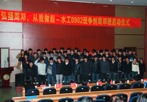3月9日下午,水工0902班在信息楼报告厅举行了以“学习周邓精神,从我做起”为主题的争创“周邓班”启动仪式,院党委书记丁坚钢、院团委副书记黄暖、水利系副主任(主持工作)沈自力、水利系副主任高永胜、水工0902班德育导师吴玲洪、水工0902班辅导员施鸿,水工0902班班主任刘述丽等出席了启动仪式。