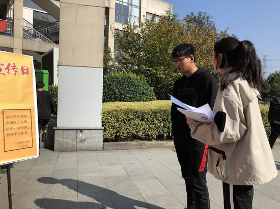 11月9日,是我国第28个消防宣传日,消防宣传的主题是“全民参与,防治火灾”,为全力打造平安校园、安全生活,坚决遏制季节交替时期火灾高发势头,进一步提高师生的消防安全意识和自防自救能力,大禹2018班开展了争创“周邓班”校园消防宣传日活动,于11月9日在校园里组织了消防安全知识的宣传和教育活动。