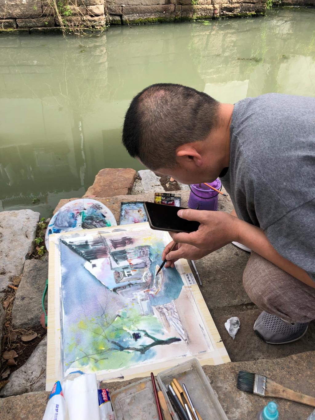 艺设系党员教师卿笑天在小桥流水人家旁开始她的写生课,她讲到大家要通过寻访最真实的古镇面貌,感悟甪直古镇传统的文化魅力,融入传统文化元素进行艺术创作,这既是对自身艺术修养的提炼,也是优秀传统文化的传播路径,不仅有利于提升思政教学的感染力,还对大学生艺术素养的提高大有裨益,文化自信也得以增强。数字媒体艺术设计专业部主任范铮在甪直美术馆进行现场教学,以艺术家的绘画作品为范例,介绍写生绘画过程中速写与色彩画的特性,画面的选择与处理。鼓励学生们用画笔描绘美丽的江南水乡和乡村美景。