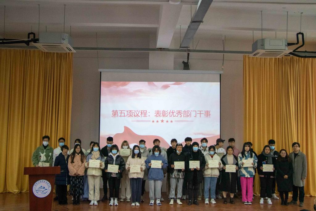 方志英书记致开幕词。首先她对团学部门在过去的一年里取得的成绩给予充分的肯定。过去的一年,建筑工程系团学工作能紧紧围绕院系中心工作,认真落实各部门职能,开拓创新、团结奋斗,在疫情防控、学生返校、志愿服务、校园文化活动、暑期社会实践等工作中取得了较好的成绩。同时结合“周恩来班”“邓颖超班”创建、学风建设、创新创业等工作,指出了不足。希望新一届团学干部干事能够戒骄戒躁,继续奋进,创造新辉煌,谱写新华章。学生干部和优秀干事代表相继上台发表感言,他们表示,全体团学人今后必将争做模范先锋、勇于奉献服务、努力勤学创新,秉承“厚德、笃学、修能”的校训,坚定“弘扬勤学文化,传承鲁班精神”的信念,以更加饱满的热情和充沛的精神状态,誓做广大青年学生群体中的排头兵和领头羊。最后,各位领导和辅导员为新一届团学干部、“优秀团学干部”和“优秀部门干事”颁发聘书和荣誉证书。