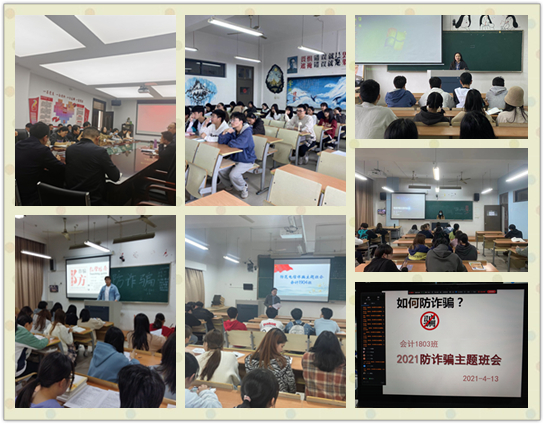 各班级召开“防范电信网络诈骗”主题班会,着重分析了当前网络电信诈骗呈案件频发、涉案数额巨大、犯罪手段多样化等特点;被骗人群以青年人居多;受骗原因多为对网络依赖程度高、社会经验不足、心理防线弱、抵制不住金钱的诱惑、对诈骗行为警惕性不足等。同时开展批评与自我批评,指出大学生在受骗过程中存在的法治意识淡薄、求职心切、虚荣消费等心理。