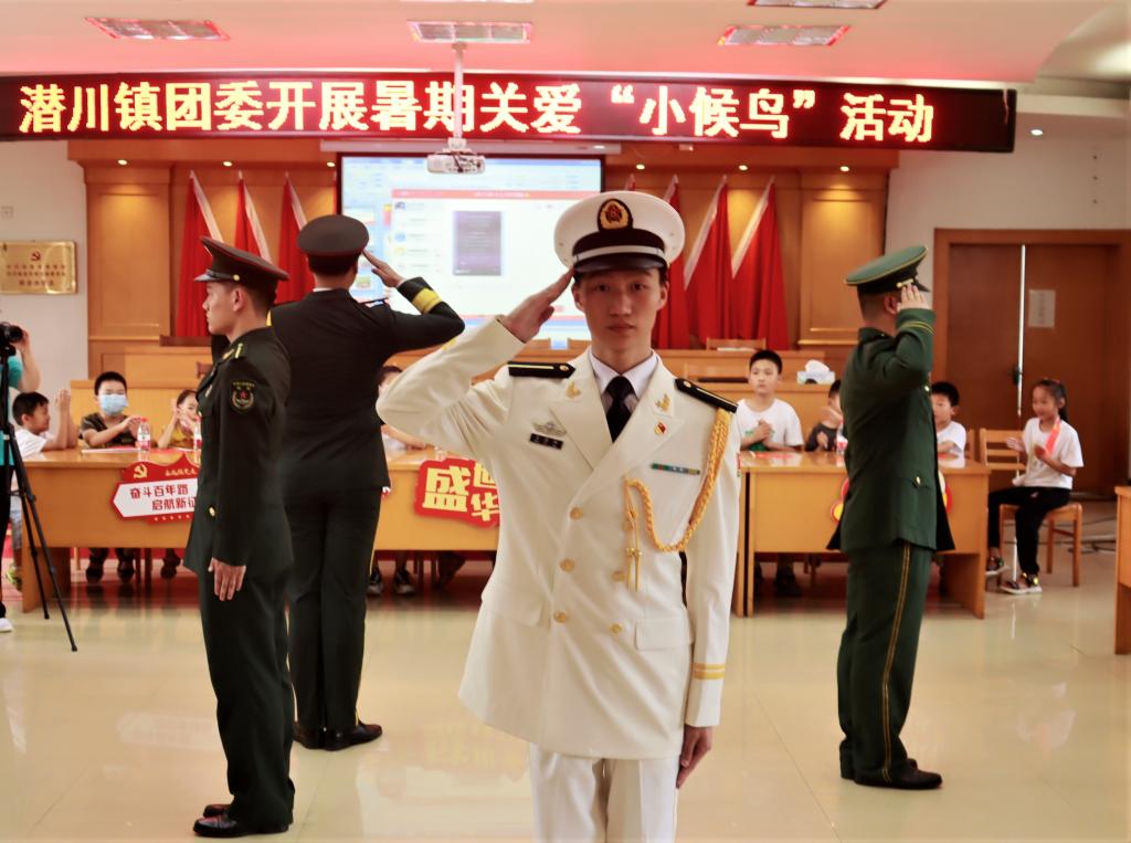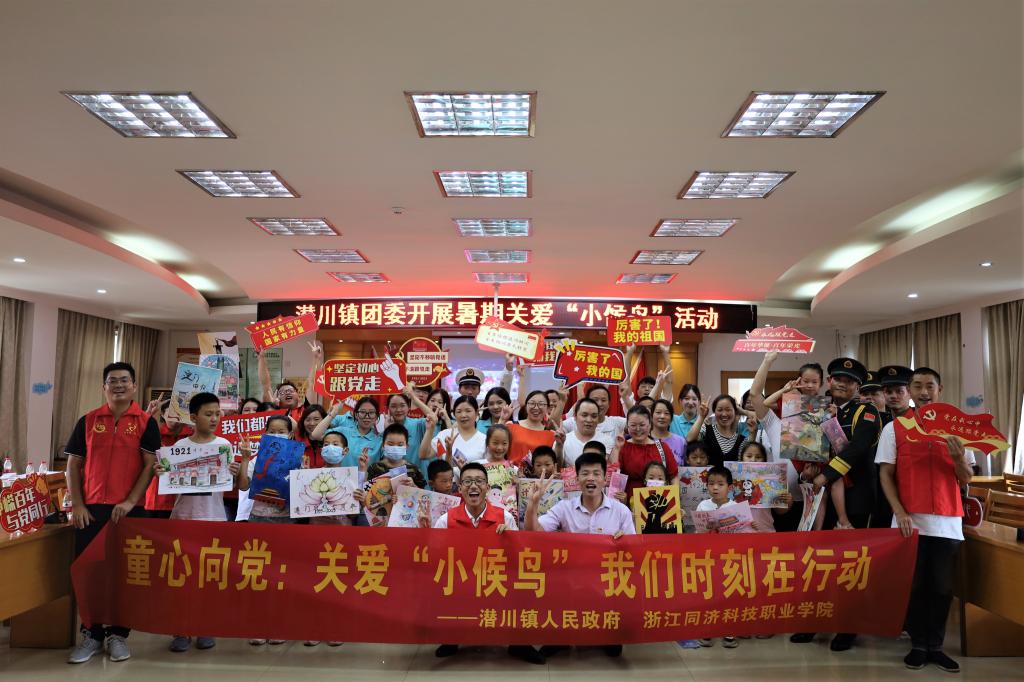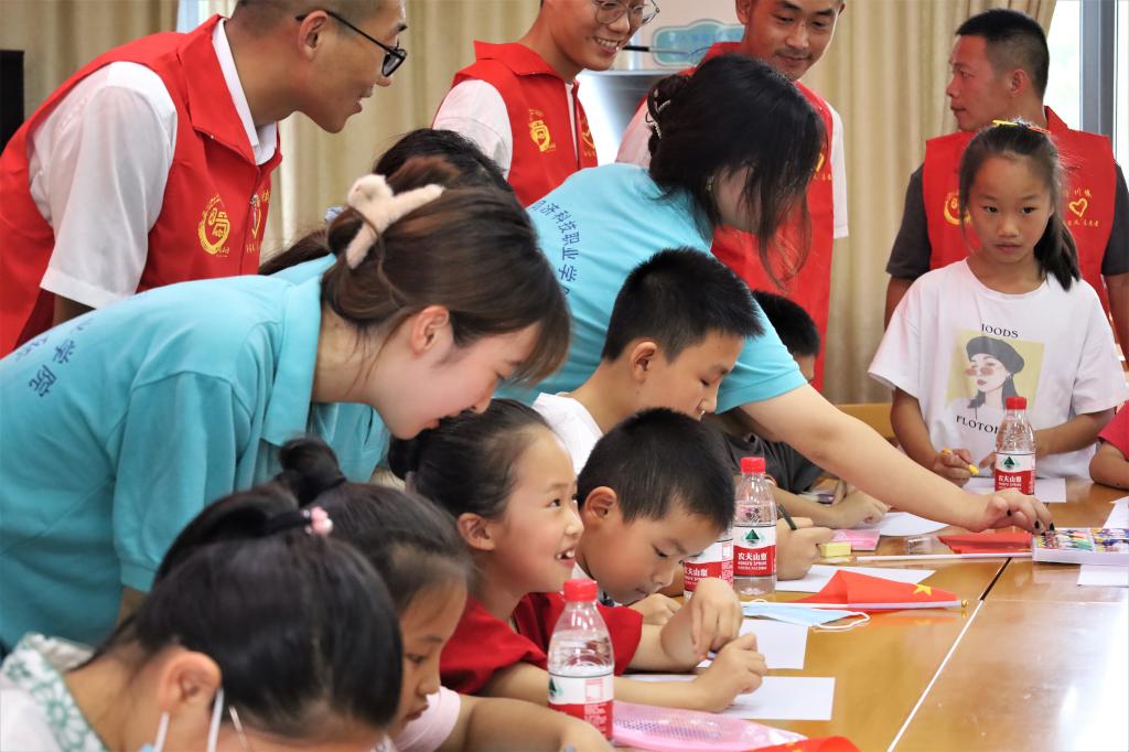 为了将爱民精神发扬光大,让爱民情怀继续在这片土地上传承永续,“小水滴”团队的五位退伍大学生组成宣讲团,向潜川镇的“小候鸟”们宣扬赵尔春烈士的英雄事迹和爱民初心,也向小朋友们讲述自己参军入伍的红色故事,弘扬水利学子的青春正能量。童心向党——大手拉小手,实践队成员还与小朋友们一起以“致敬百年风华,歌舞千秋伟业”为主题唱红歌、舞青春、绘就五星红旗。