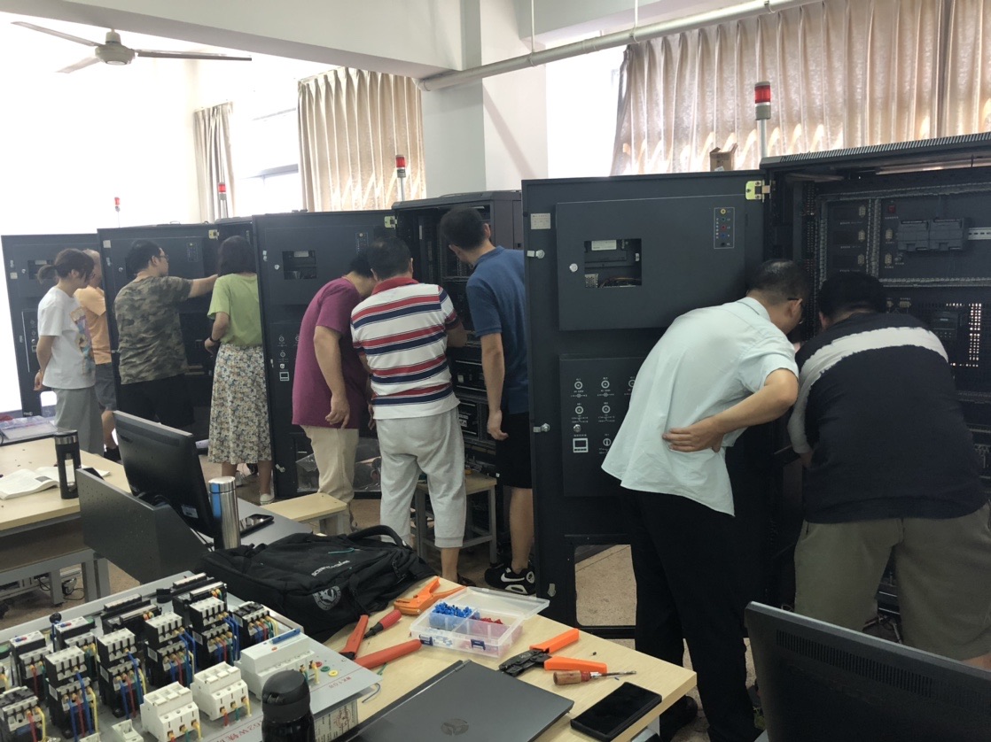 电气自动化、机电一体化、数控技术、电梯工程、发电厂与电力系统等专业的十六名专任教师参加了本次内训,电气自动化专业带头人、专业部主任蒋元星负责本次内训授课。课程包括步进电机、伺服电机与PLC控制、PLC通讯、计算机控制与组态、智能工厂参观、总结交流等内容。内训课程按照一体化教学模式开展,参训教师积极动手训练:做线头、接线、编程、下载、调试,学得不亦乐乎。机电工程学院高度重视提升教师教学技能,连续两年暑假安排专任教师的暑期内训,通过召开新教师座谈会、组织教师教学能力大赛、开展日常教研等活动,不断促进教师教学能力提升。