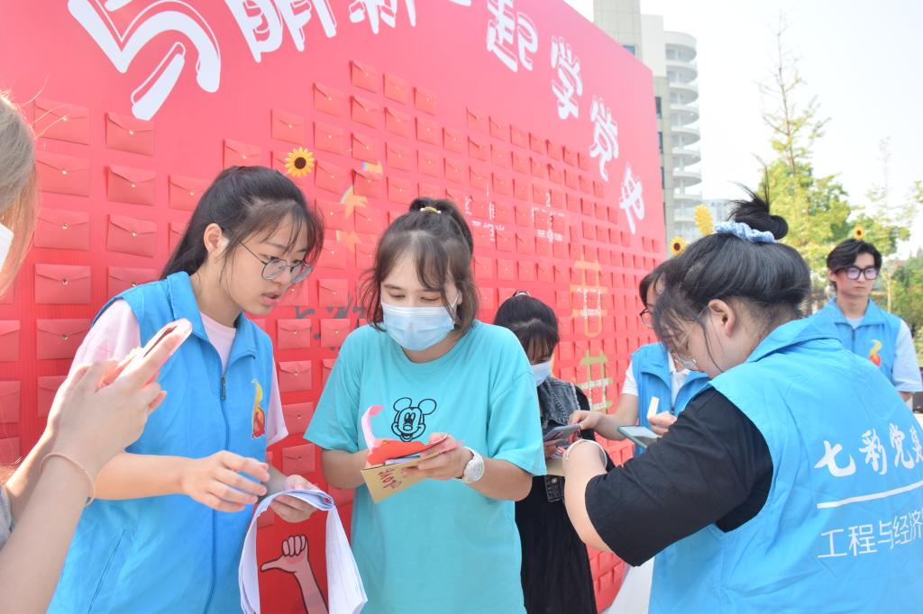 在经信学院迎新班级报到点,一面红色喷绘张贴了562个红色信封。每个红色信封都装了一个党史题目。新生在完成报到流程之后,来到党史学习阵地,抽取一个答题红包,红包内党史题目丰富多彩,形式多样,回答正确即可获得一个新生大礼包。回答错误的同学可以通过求助现场同学和老师再回答一次。初入校园的同学被这种新颖的学习形式深深吸引,现场参与度极高,同学们表示这样的学习形式生动有趣、记忆深刻。每个同学答题之后,可以拿到学院为他们定制的21级新生大礼包。部分党员教师也参与到答题活动中,与学生一起学党史、话初心。