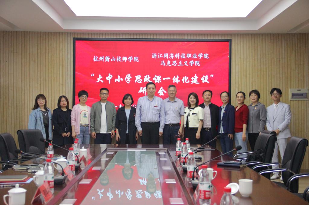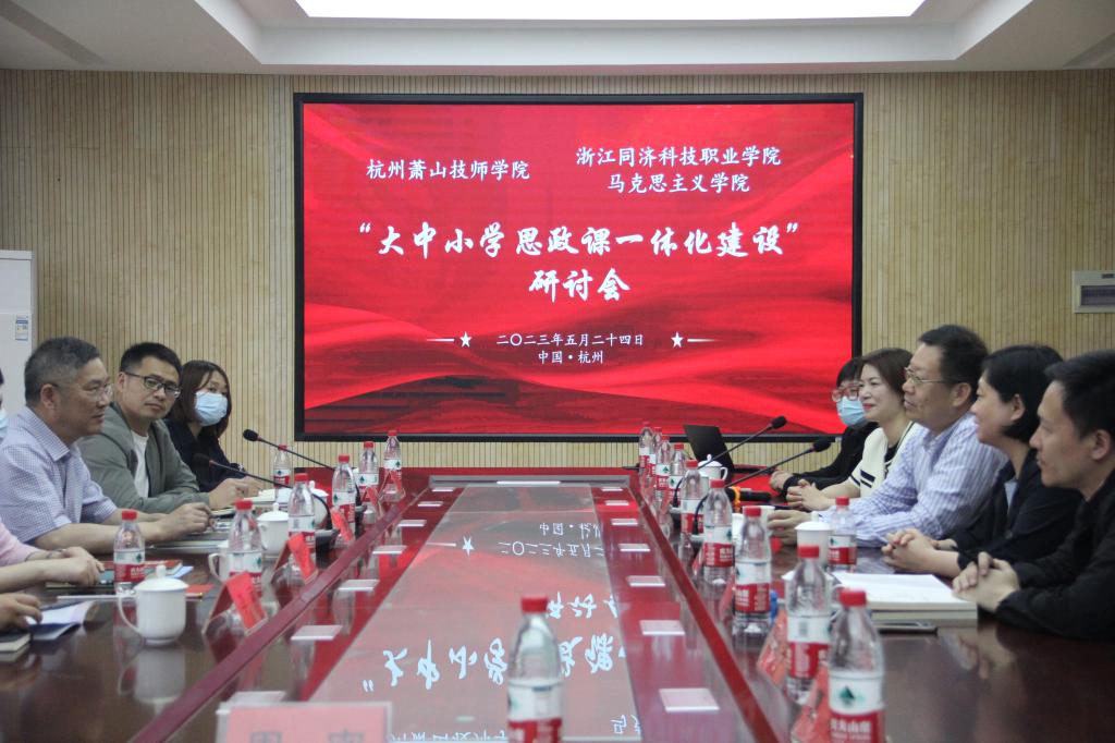 为积极落实教育部、中宣部等十部门《全面推进“大思政课”建设的工作方案》和教育部办公厅《关于开展大中小学思政课一体化共同体建设的通知》等文件精神,完善高校与中小学协同共建思政课建设长效机制。5月24日下午,马克思主义学院与杭州萧山技师学院召开了“大中小学思政课一体化”建设研讨会。杭州萧山技师学院校党委书记王尧林、教务处副主任吴海明、教务处副主任、基础部负责人邵华美等一行5人到校交流研讨,我校党委书记张勇、党委委员、组织部部长吴玲洪、马克思主义学院班子成员、教研室主任以及骨干教师参加了此次会议,会议由马克思主义学院主持工作副院长阮红芳主持。