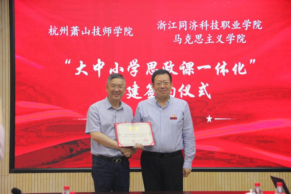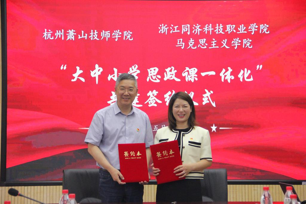 阮红芳院长与杭州萧山技师学院王尧林书记签署了《大中小学思政课一体化共建合作协议》,并聘任王尧林书记为我校“大思政课”校外特聘教授。马克思主义学院今后将继续积极推动大中小学思政课一体化建设,切实发挥思政课立德树人的关键课程作用。